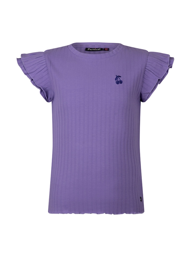 Fijn blanco T-shirtje met een grove rib. Dit shirtje heeft een ruche mouw en een klein onopvallend kersenborduurseltje voorop. Makkelijk te combineren met vele kledingstukken.