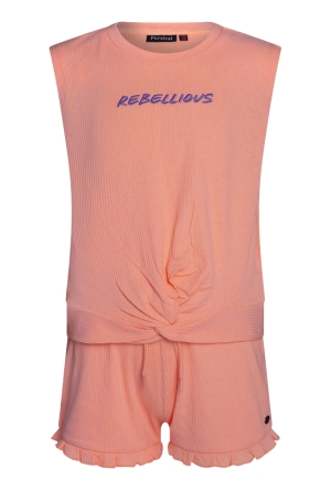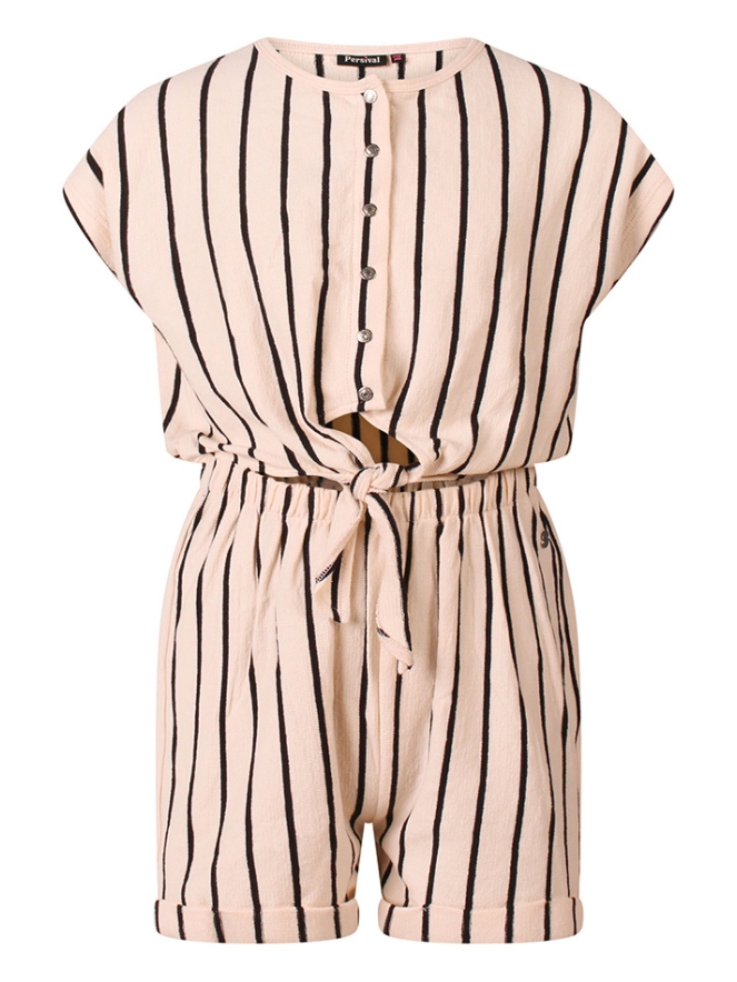 Jumpsuit met een flatterend verticaal streeppatroon en een knoopdetail in de taille voor een mooi silhouet. Sluiting is door middel van knoopjes. Het model heeft korte mouwen, een ronde hals en een short, wat zorgt voor een luchtige en comfortabele look met een stijlvolle uitstraling.