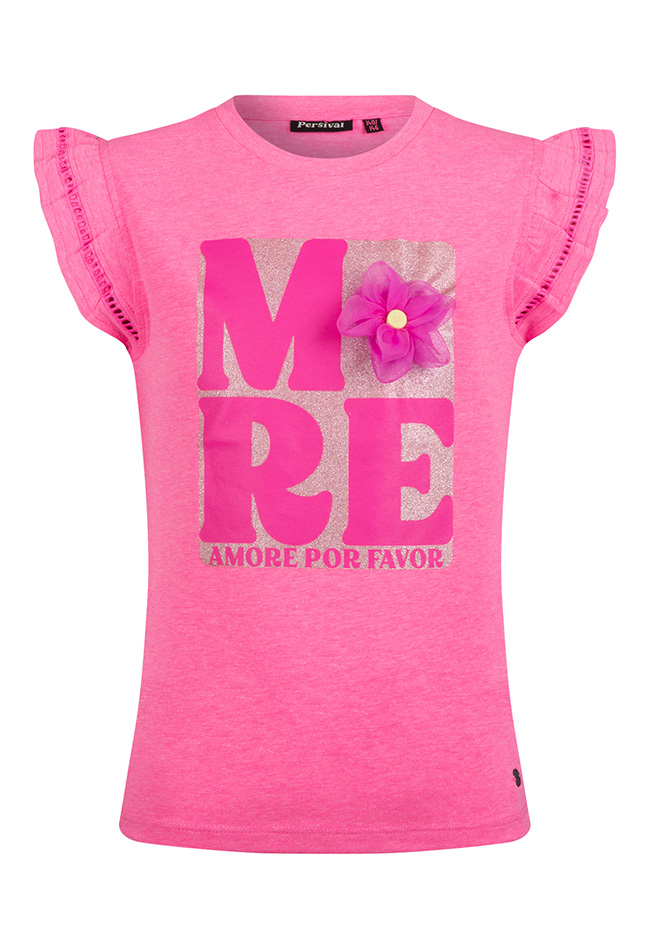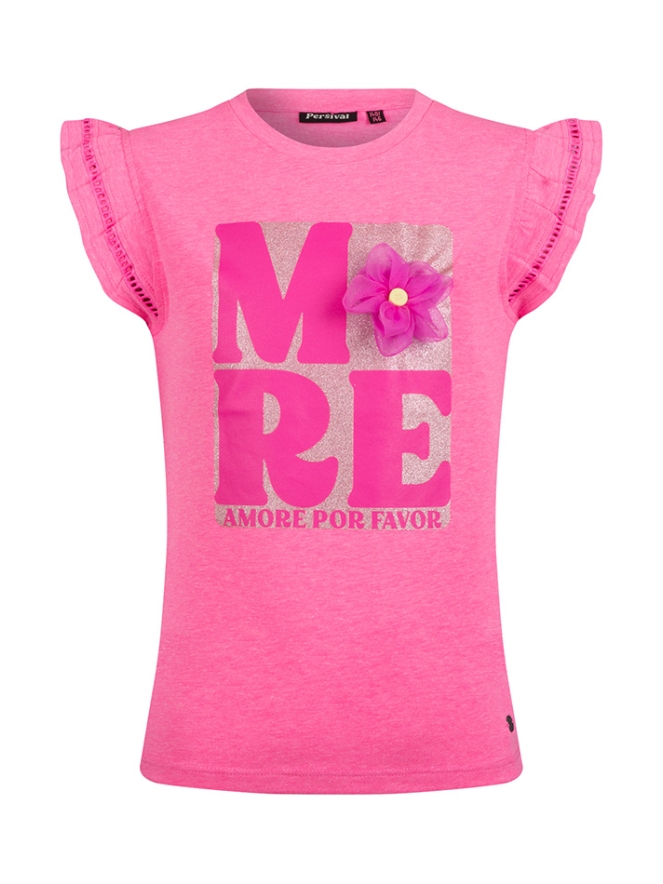 Dit schattige meisjes T-shirt combineert stijl en speelsheid! Het shirt heeft een vrolijke print met de tekst More Amore Por Favor, waardoor het een echte eyecatcher is. Een bijzonder detail is de afneembare bloem: deze kan je eenvoudig verwijderen voordat je het T-shirt wast, zodat de bloem mooi blijft en het shirt lang meegaat.