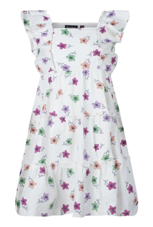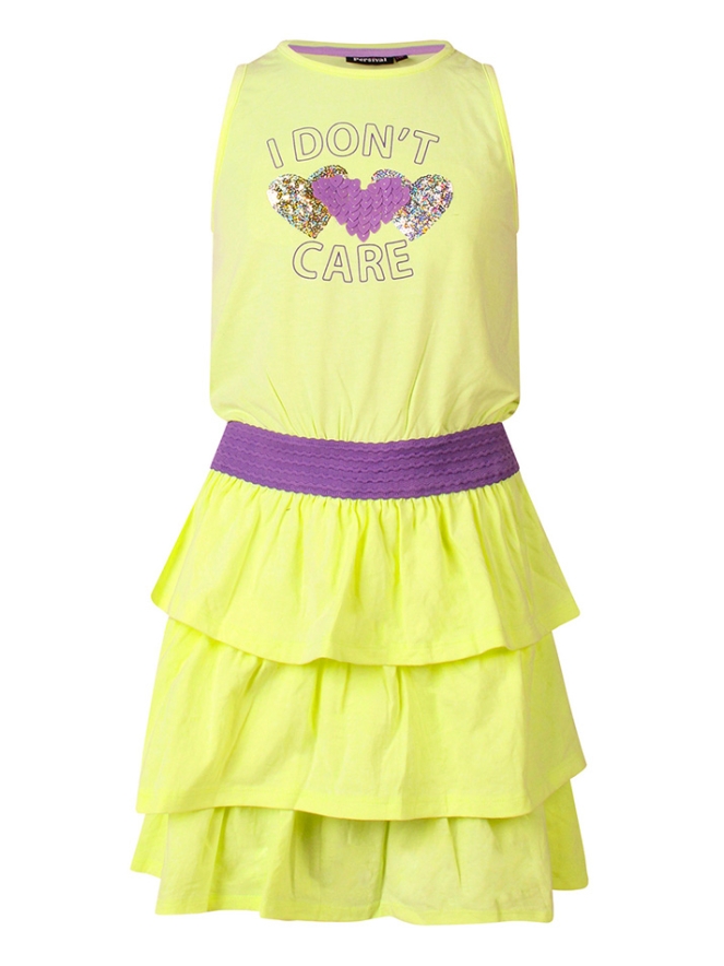 Dit mouwloze jurkje is uitgevoerd met een vrolijk strokenrokje dat zorgt voor een zwierig en luchtig effect bij elke beweging. De opvallende tekst I donâ??t care is afgewerkt met glinsterende pailletten, wat het jurkje een trendy en eigenwijze uitstraling geeft.