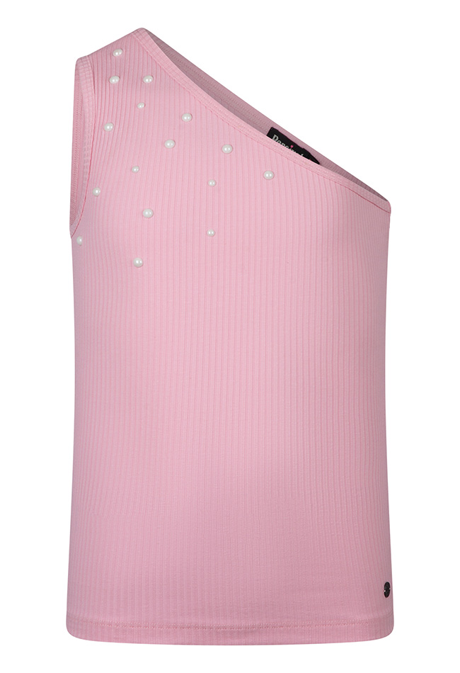 Rib top met een trendy asymmetrisch design en verfijnde pareldetails. De aangesloten pasvorm en unieke snit geven de top een stijlvolle en eigentijdse uitstraling.