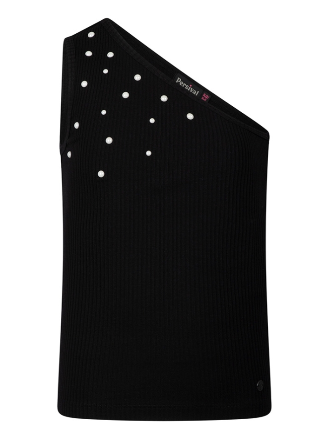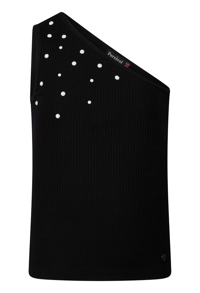 Rib top met een trendy asymmetrisch design en verfijnde pareldetails. De aangesloten pasvorm en unieke snit geven de top een stijlvolle en eigentijdse uitstraling.