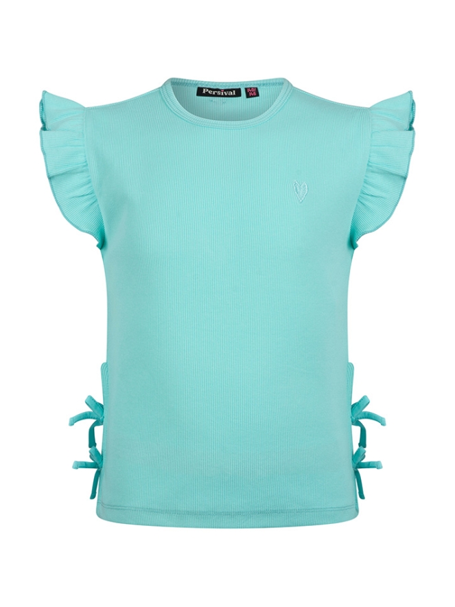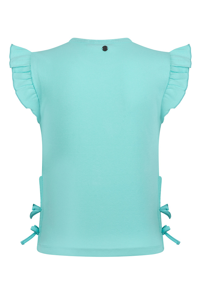 Lief meisjes shirt met een ronde hals en een speelse uitstraling. De roezelmouwtjes geven het topje een vrolijk en zomers effect, terwijl de strikjes aan de zijkant zorgen voor een extra schattig detail. Gemaakt van zacht en comfortabel materiaal, ideaal voor warme dagen. Perfect te combineren met een short, rokje of jeans voor een frisse en stijlvolle outfit.
