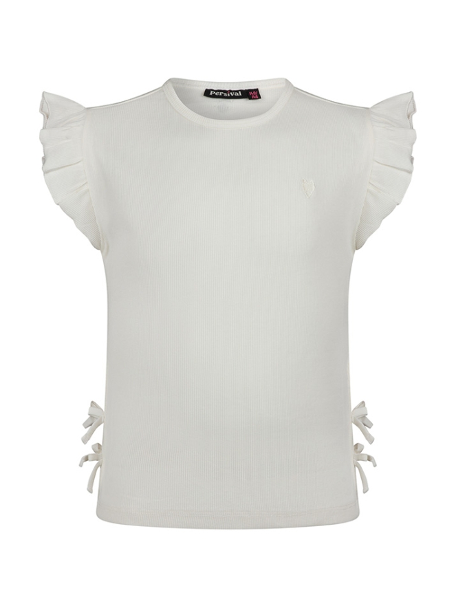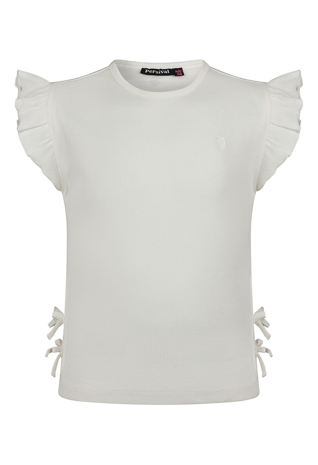 Lief meisjes shirt met een ronde hals en een speelse uitstraling. De roezelmouwtjes geven het topje een vrolijk en zomers effect, terwijl de strikjes aan de zijkant zorgen voor een extra schattig detail. Gemaakt van zacht en comfortabel materiaal, ideaal voor warme dagen. Perfect te combineren met een short, rokje of jeans voor een frisse en stijlvolle outfit.
