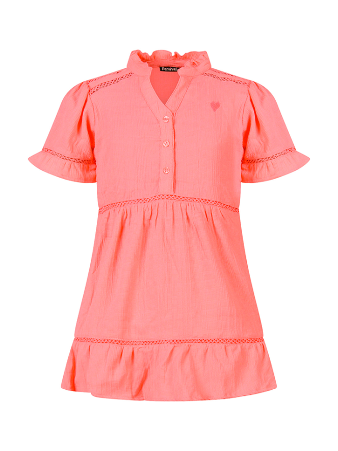Deze meisjesjurk van Persival is perfect voor feestjes of zomerse dagen. Gemaakt van lichte mousseline voelt de jurk zacht en luchtig aan, ideaal voor actief speelplezier of een speciale gelegenheid. De jurk heeft een korte mouw, een V-hals en een speelse strokenrok met subtiele lace tape details, wat zorgt voor een trendy en zwierig effect bij elke beweging. Een klein hartje op de borst voegt een lief en opvallend detail toe. De lengte maakt hem ideaal voor warme dagen.