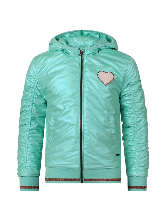 Metallic pufferjas met capuchon, gerimpelde afwerking, streekzakken en een applicatie van een hartje op de borst.
