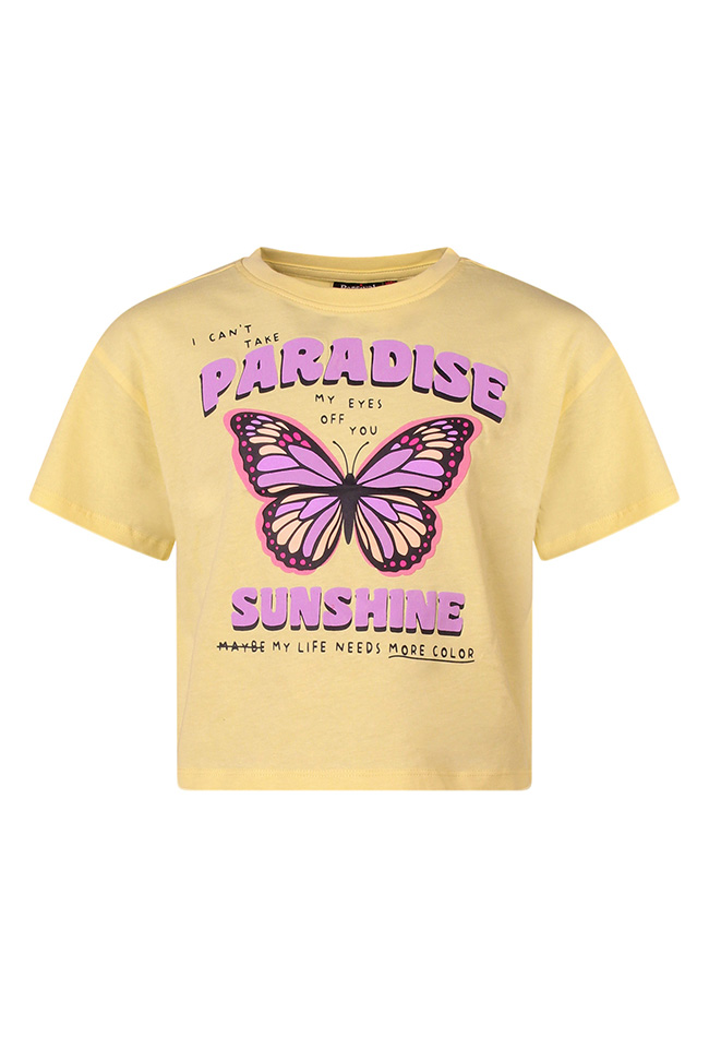 Dit meisjes T-shirt is een echte blikvanger. Op de voorkant prijkt de speelse vlinderprint, terwijl de tekst I can't take my eyes off you een vrolijke, charmante touch geeft. Met dit T-shirt straalt ze pure zomerenergie uit en trekt ze alle blikken naar zich toe, net als een echte sunshine girl! Een T-shirt dat elke outfit direct een zonnige, vrolijke vibe geeft.