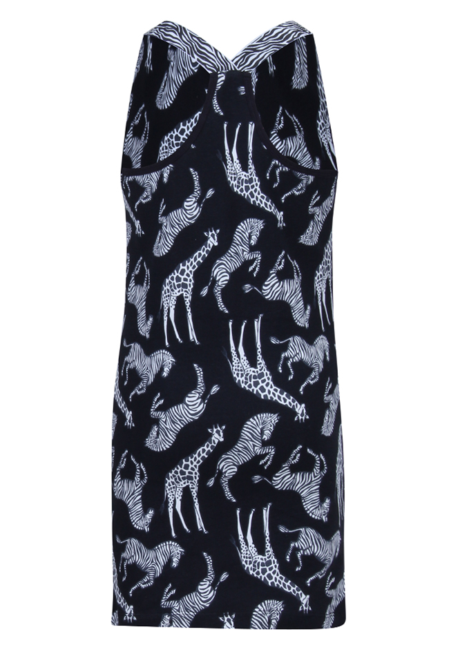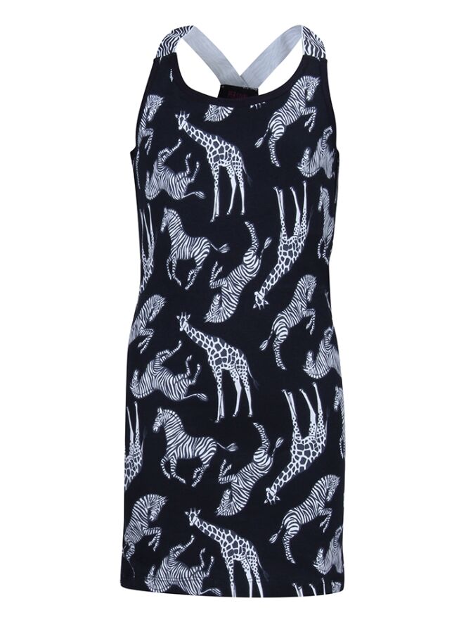 Zomer jurk voor meisjes. De jurk heeft een zebra en giraffen print en zebra print schouderbandjes van dik elastiek. Materiaal: 95% katoen, 5% elastaan
