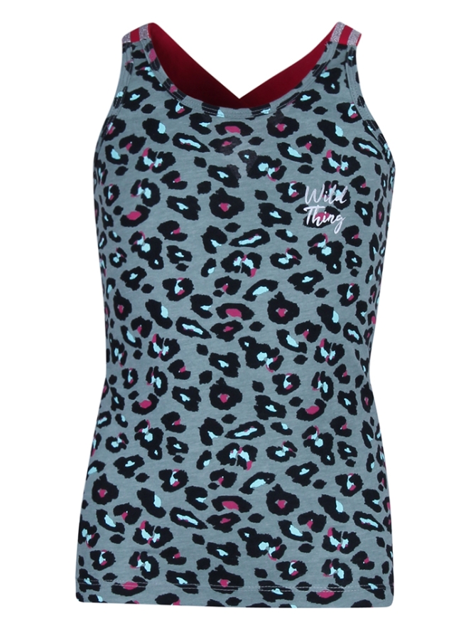 Mouwloze top met panter print van Persival. Het hemd heeft een panter print en gekruiste schouderbanden, aan de linker bovenkant staat Wild Thing in het klein. Materiaal: 50% polyester, 50% katoen