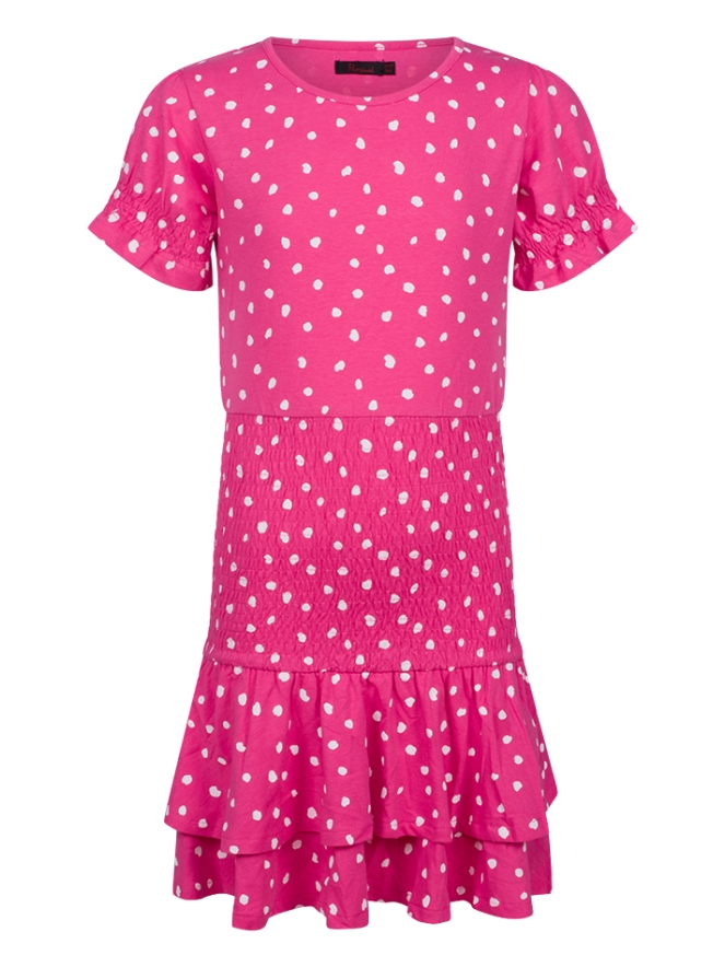 Jurk van Persival. De jurk heeft een all over stippen print en smock details bij de mouwen en de taille. Het jurkje heeft een laagjes rokje. Materiaal: 50% katoen, 50% polyester. Wassen op 30 graden, niet in de droger, niet bleken, kan gestreken worden.