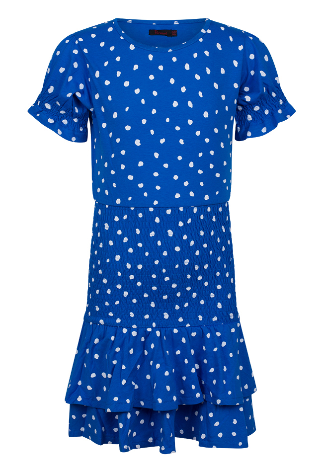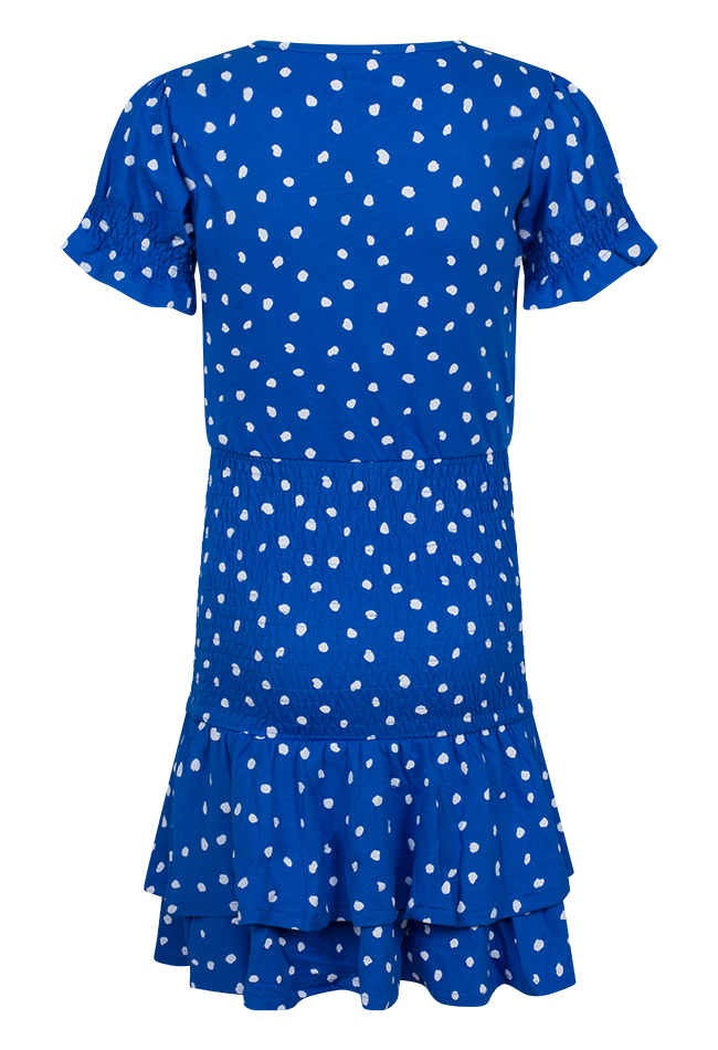 Jurk van Persival. De jurk heeft een all over stippen print en smock details bij de mouwen en de taille. Het jurkje heeft een laagjes rokje. Materiaal: 50% katoen, 50% polyester. Wassen op 30 graden, niet in de droger, niet bleken, kan gestreken worden.
