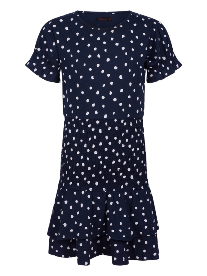 Jurk van Persival. De jurk heeft een all over stippen print en smock details bij de mouwen en de taille. Het jurkje heeft een laagjes rokje. Materiaal: 50% katoen, 50% polyester. Wassen op 30 graden, niet in de droger, niet bleken, kan gestreken worden.