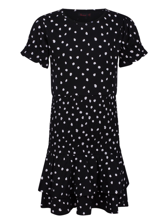 Jurk van Persival. De jurk heeft een all over stippen print en smock details bij de mouwen en de taille. Het jurkje heeft een laagjes rokje. Materiaal: 50% katoen, 50% polyester. Wassen op 30 graden, niet in de droger, niet bleken, kan gestreken worden.