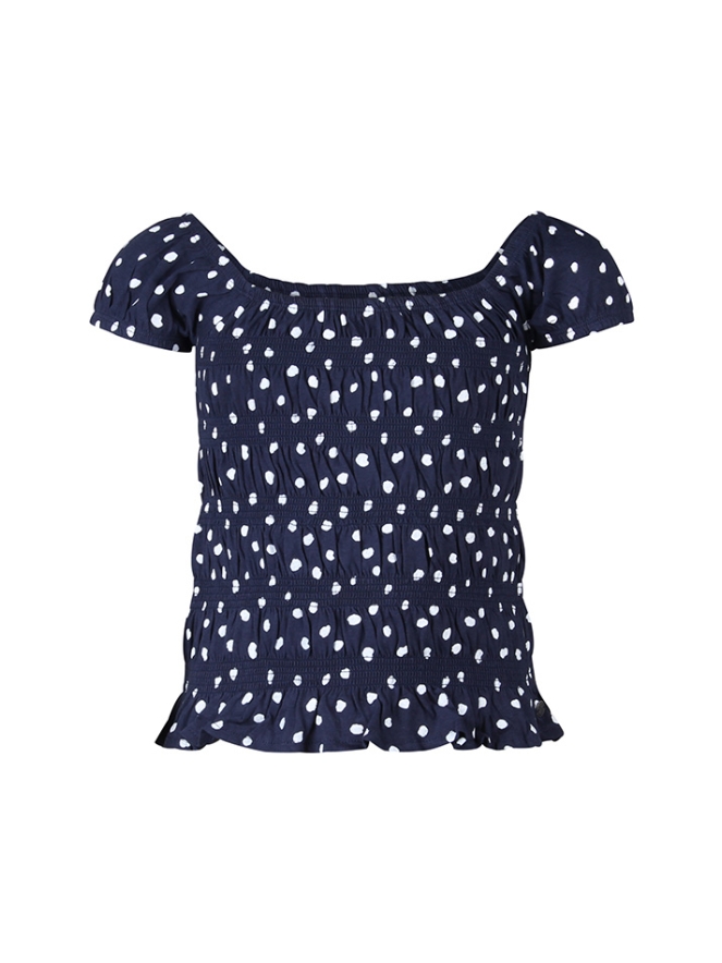 Smock t-shirt van Persival. Het t-shirt heeft een all over stippen print. Het t-shirt is gesmockt en heeft off shoulders. Materiaal: 100% katoen. Wassen op 30 graden, niet bleken, niet in de droger, kan gestreken worden.