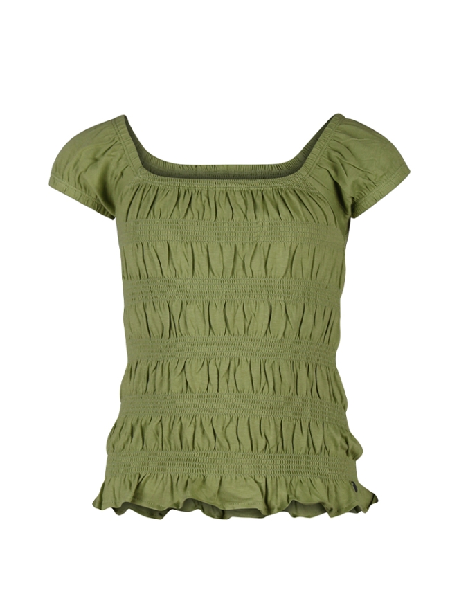 Smock top van Persival. De top heeft een smock body en pofmouwtjes. De onderkant heeft een roezeltje. Materiaal: 100% katoen. Wassen op 30 graden, niet bleken, niet in de droger, kan gestreken worden.