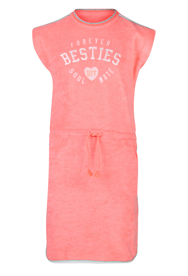 Jurkje van Persival. Het jurkje is van badstof en heeft een sportieve look door de witte bies. Op de voorkant staat een tekst en in de taille zit een touwtje. De jurk heeft zakken. Materiaal: 70% katoen, 30% polyester. Wassen op 30 graden, niet bleken, niet in de droger, kan gestreken worden.