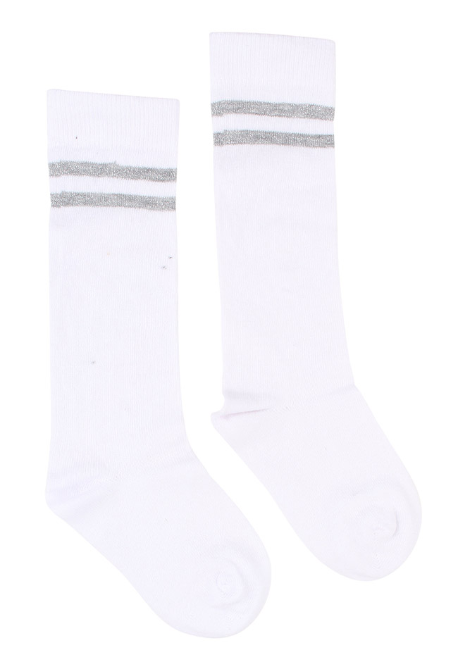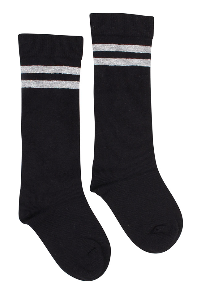 Kniekousen van Persival. 2 paar sokken met dubbele glitter streep. Materiaal: 78% katoen, 20% polyamide, 2% elasthan. Wassen op 30 graden.