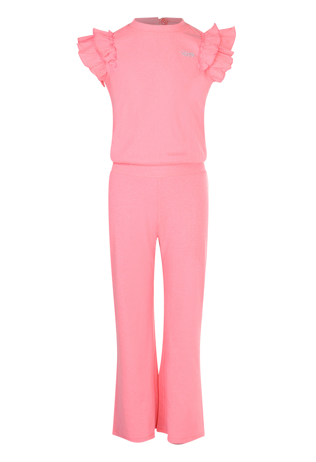 Deze jumpsuit heeft ruche mouwen, wijde pijpen, ronde hals en een elastische taille. De jumpsuit is verkrijgbaar in drie verschillende kleuren.