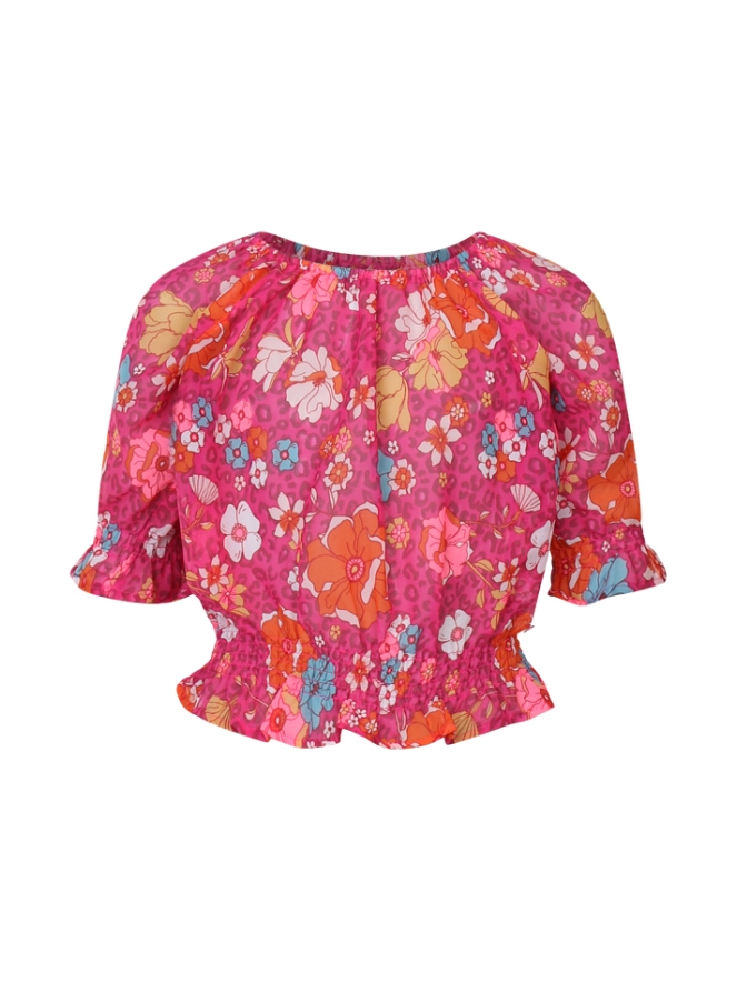 Korte top met korte mouwen een allover retrobloemenprint en een smockband aan de onderkant.