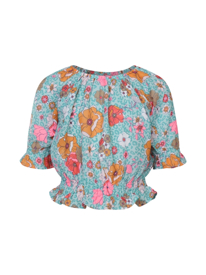 Korte top met korte mouwen een allover retrobloemenprint en een smockband aan de onderkant.