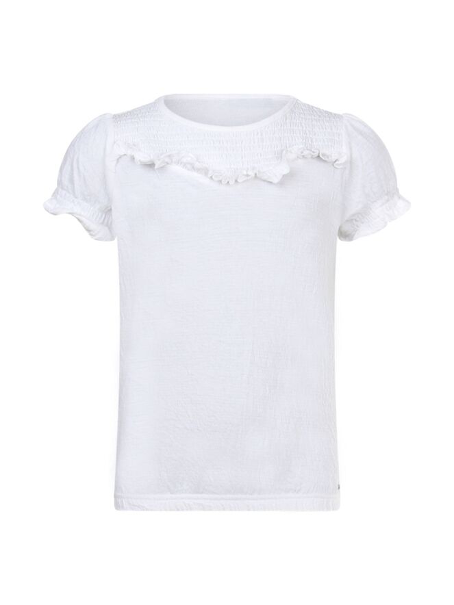 T-shirt met een ronde hals en korte pofmouwen met een elastische boord. Aan de voorkant van het t-shirt zit een smock detail met een ruche. De onderkant heeft een elastische boord. Het t-shirt is verkrijgbaar in vier verschillende kleuren.