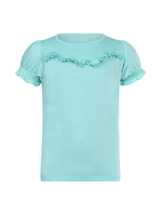 T-shirt met een ronde hals en korte pofmouwen met een elastische boord. Aan de voorkant van het t-shirt zit een smock detail met een ruche. De onderkant heeft een elastische boord. Het t-shirt is verkrijgbaar in vier verschillende kleuren.