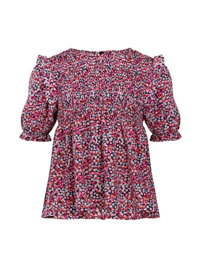 Deze blouse heeft een allover bloemenprint met smokwerk aan de bovenkant. De pofmouwen hebben aan het einde een elastische boord met ruche. In de nek zit een klein sluitknoopje.