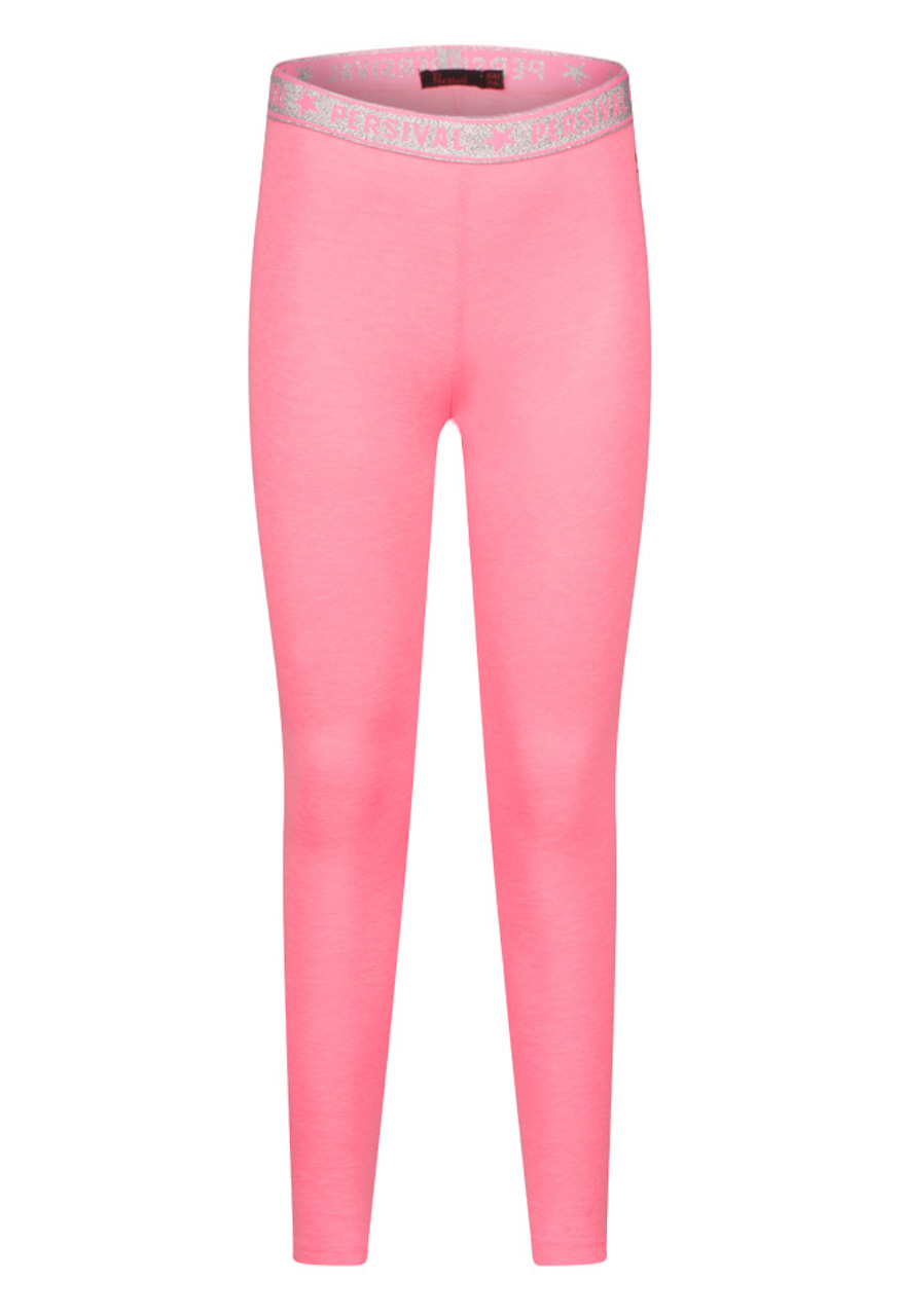 Legging van Persival. Deze legging heeft een lange lengte. De taille heeft elastieken glitter band. Hij is verkrijgbaar in 10 zomerse kleuren. Ideaal om te combineren met een rokje, jurkje of korte broek.