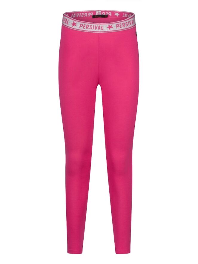 Legging van Persival. Deze legging heeft een lange lengte. De taille heeft elastieken glitter band. Hij is verkrijgbaar in 10 zomerse kleuren. Ideaal om te combineren met een rokje, jurkje of korte broek.