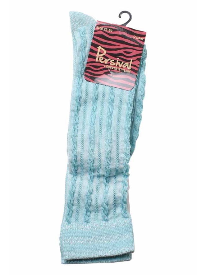 Kniekous voor meisjes van Persival. Deze kousen hebben een kabelmotief en glitter in de lurex boord, teen en hak. Per 2.