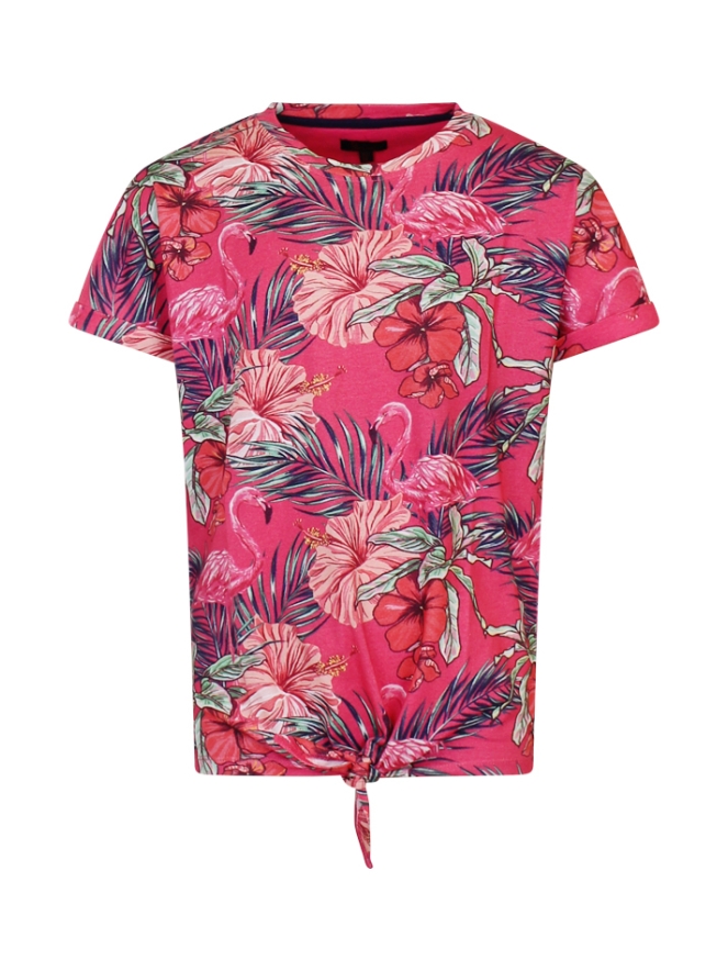 T-shirt met korte mouwen, ronde hals een knoopdetail aan de voorkant en een allover tropische print.
