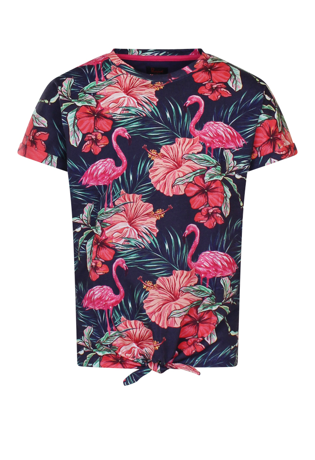 T-shirt met korte mouwen, ronde hals een knoopdetail aan de voorkant en een allover tropische print.