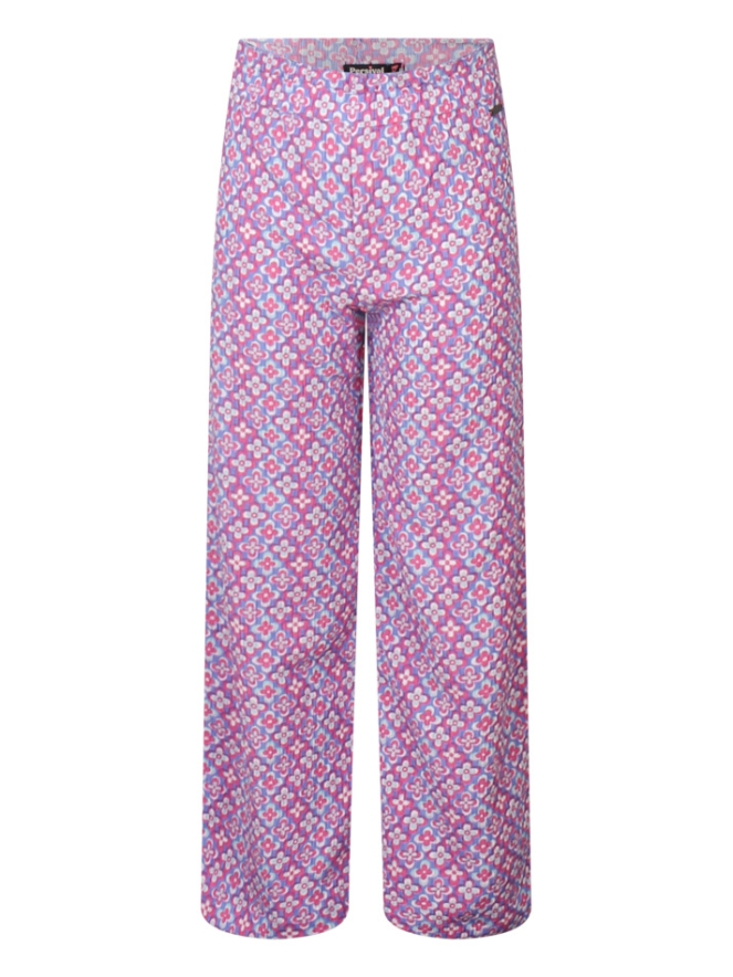 Deze vrolijke gebloemde broek van crincle stof heeft wijde pijpen. Er is een bijpassende knooptop verkrijgbaar onder art.nr. Z80100