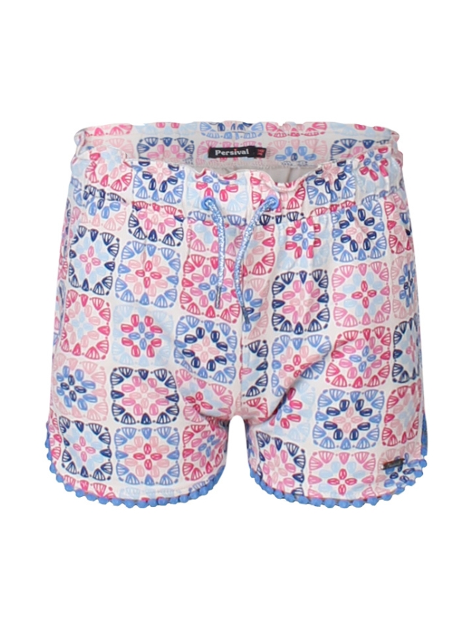 Deze short heeft twee steekzakken, een elastische tailleband met koord en een afwerking met bolletjesband aan de onderkant.