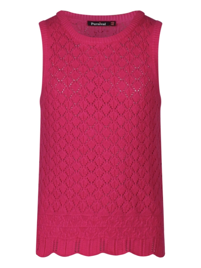 Deze singlet is eigenlijk een zomerse spencer met sierlijke afwerking onder bij de middel. Het haakpatroon is licht doorschijnend.