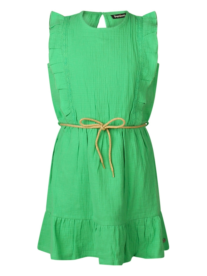 Dit jurkje van katoenen wafeldoek heeft ruches en een koordje in de middel. Op de achterkant ter hoogte van de hals zit een druppeluitsparing.