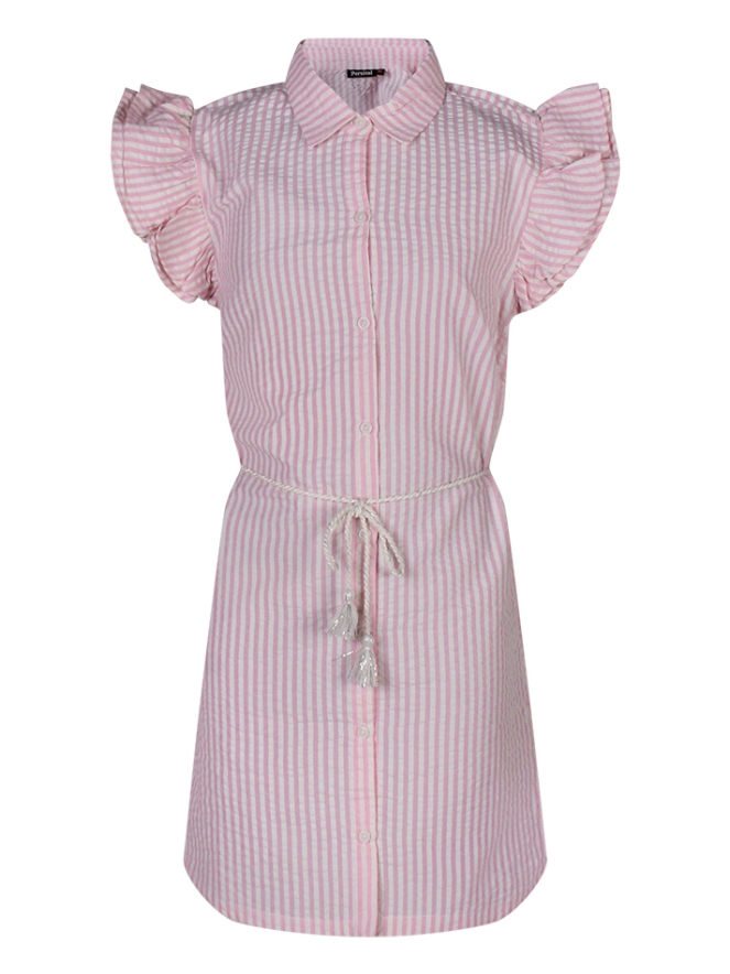 Deze meisjesjurk van Persival heeft een vrolijk streepjespatroon en een klassieke kraag voor een tijdloze uitstraling. De jurk is voorzien van een doorknoopsluiting en heeft schattige ruchemouwen die een speelse touch geven. Het koordje in de taille zorgt ervoor dat de jurk mooi kan worden aangepast voor een perfecte pasvorm.
