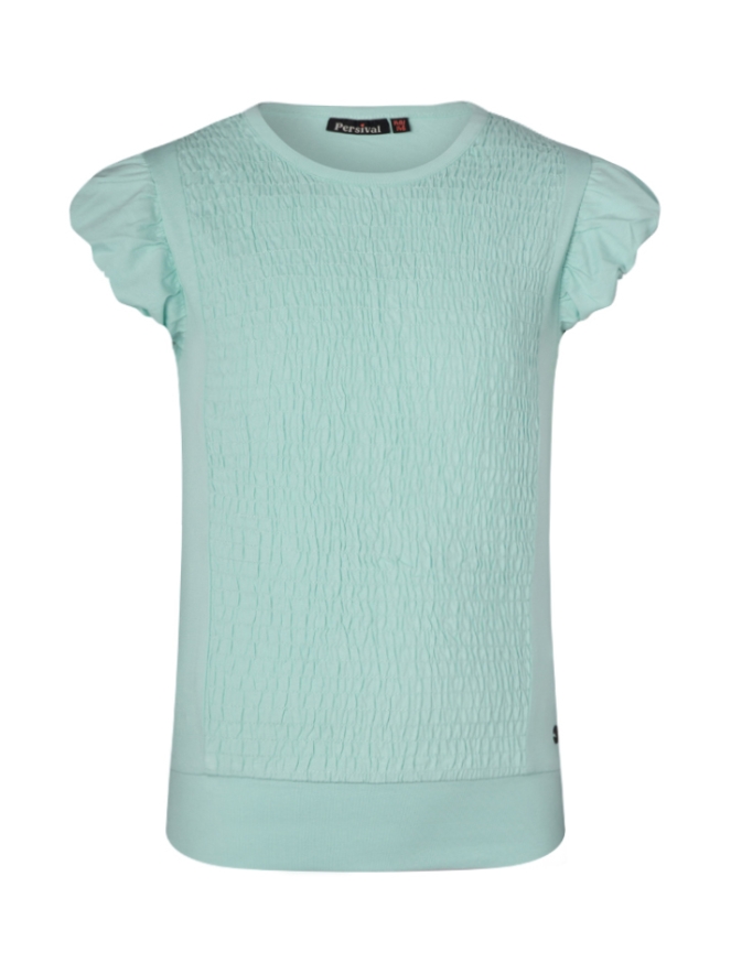 Zomers shirtje in frisse kleurtjes met een gesmockte voorkant. Dit shirtje heeft een klein pofmouwtje met onder in de taille een band. Leuk op een rokje, jeans of andere stof.