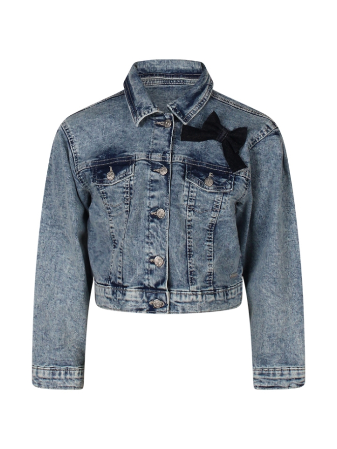 We love denim! Dit leuke spijkerjasje is een wat korter cropped en wijder boxy exemplaar met leuke strik!