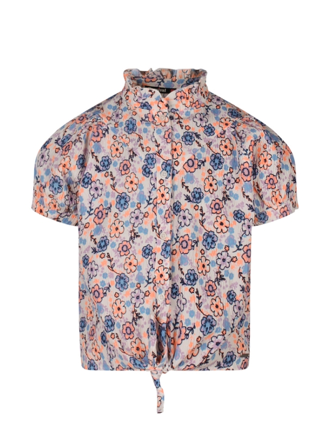 Dit vrolijke knoop blousje sluit met knoopjes en heeft een ruche rond de hals. De top gemaakt van crincle stof draagt luchtig en is leuk te combineren met de bijpassende broek Art.nr. Z90047