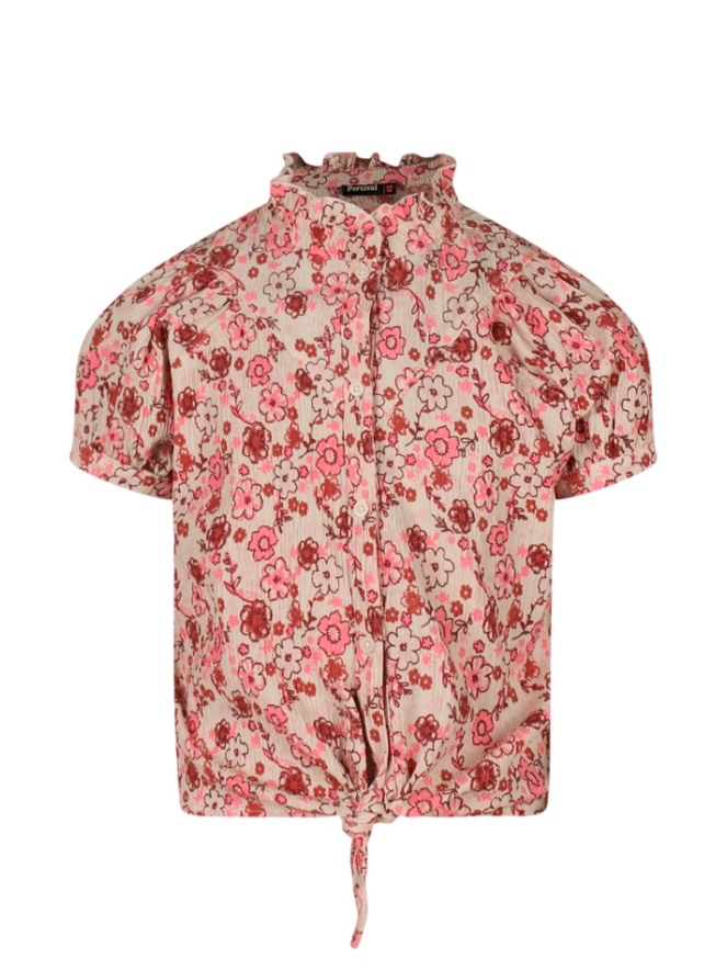 Dit vrolijke knoop blousje sluit met knoopjes en heeft een ruche rond de hals. De top gemaakt van crincle stof draagt luchtig en is leuk te combineren met de bijpassende broek Art.nr. Z90047