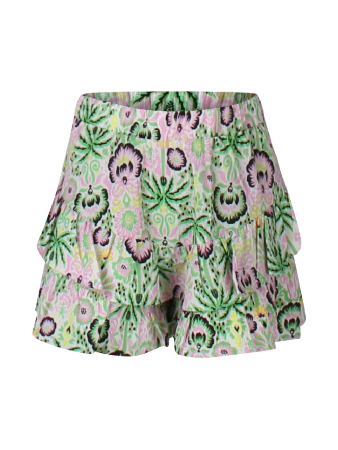 Vrolijk worden we van deze skorts! Deze korte broek heeft een grote strook voorlangs wat doet lijken dat het een rokje is! Daarom heet het een skort. Van mooie crincle stof met palmbomen en andere vrolijkheden. Bestellen maar voordat het te laat is!