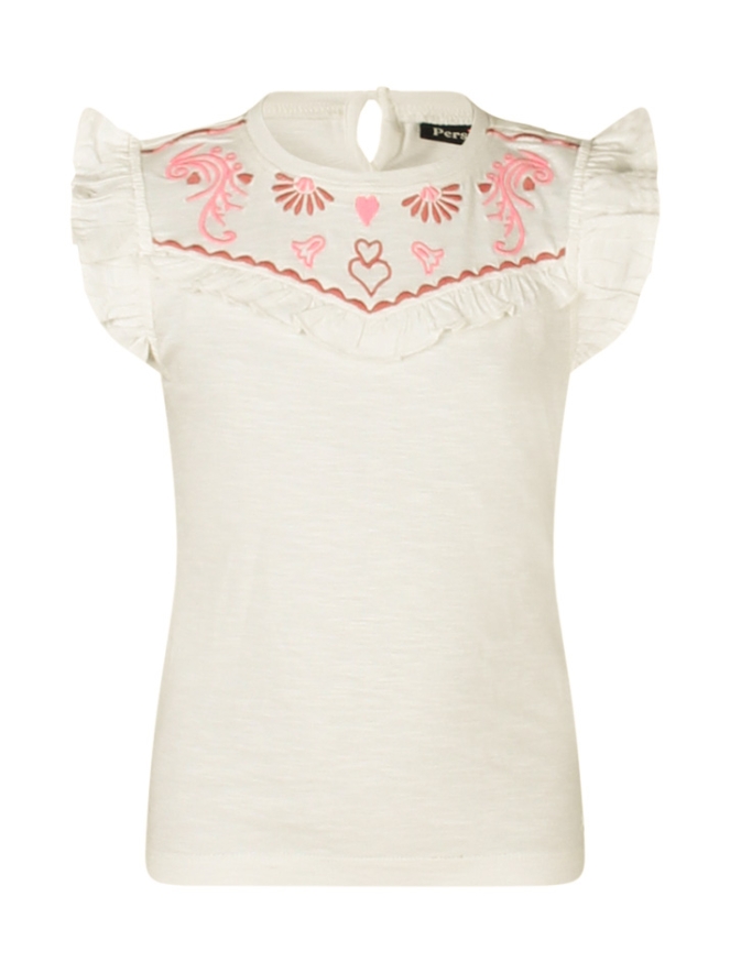 Vrolijk T-shirt met mooi borduursel en leuke ruches. Doet het goed onder een spijkerjasje of gewoon op een korte broek!