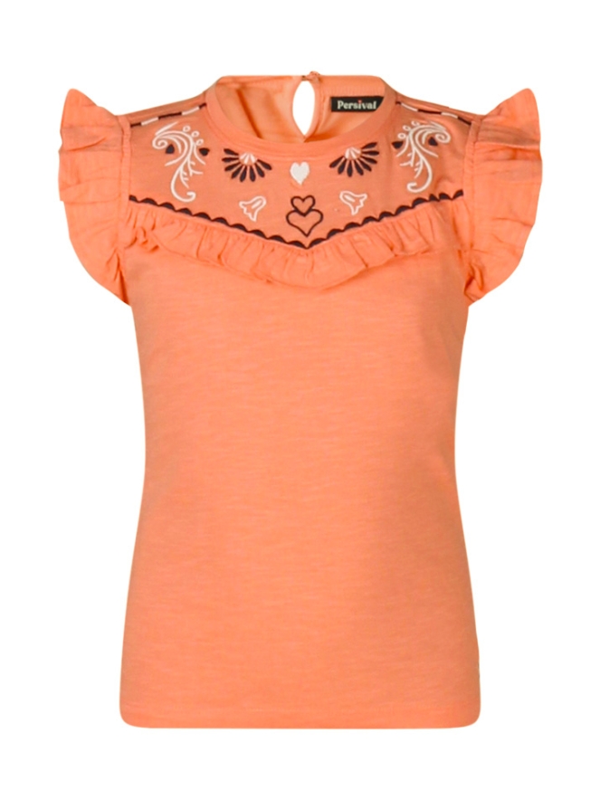 Vrolijk T-shirt met mooi borduursel en leuke ruches. Doet het goed onder een spijkerjasje of gewoon op een korte broek!