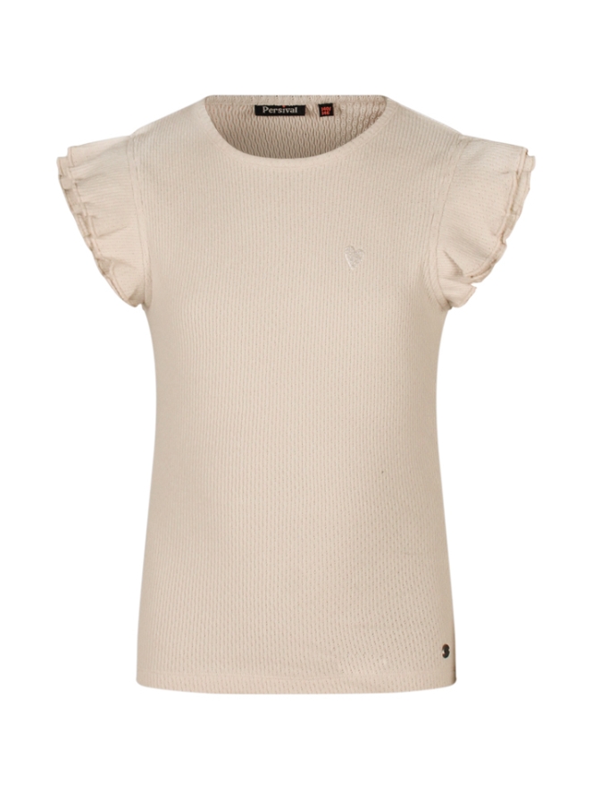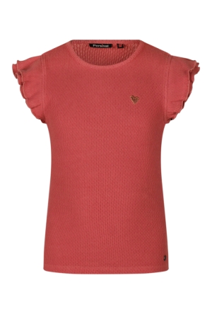 Dit meisjes singlet is gemaakt van een fijne brei ajour stof en heeft schattige ruches voor een speelse uitstraling. Het setje wordt compleet met een bijpassende short (Z90097), perfect voor warme zomerdagen.