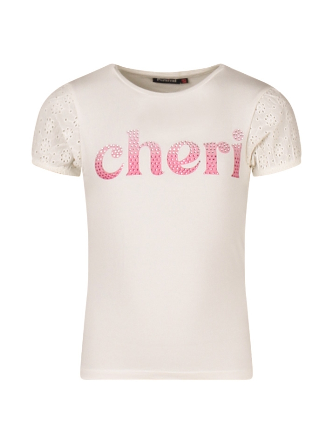 Cheri, ja dit shirt is echt een schatje! Met broderie pofmouw en mooie tekst strass print voorop. Dit trendy shirt combineer je makkelijk met spijker. Zo creeër je een trendy tijdloze look!