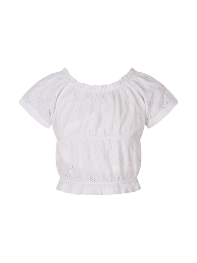 Dit zomerse shirt is een perfecte combinatie van speels en stijlvol! De ajourstof zorgt voor een luchtige uitstraling, terwijl de gesmockte details een mooie pasvorm geven. De korte mouwen en elegante boothals maken dit shirt ideaal voor warme dagen.