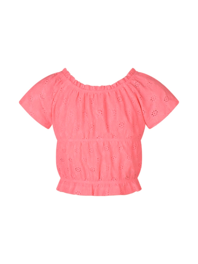 Dit zomerse shirt is een perfecte combinatie van speels en stijlvol! De ajourstof zorgt voor een luchtige uitstraling, terwijl de gesmockte details een mooie pasvorm geven. De korte mouwen en elegante boothals maken dit shirt ideaal voor warme dagen.