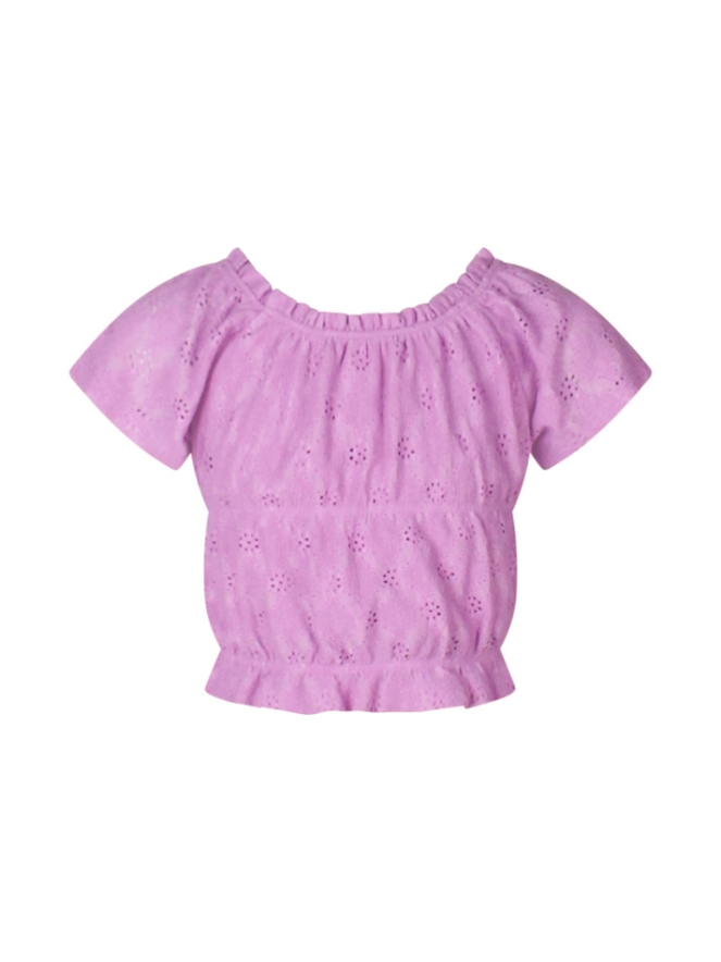 Dit zomerse shirt is een perfecte combinatie van speels en stijlvol! De ajourstof zorgt voor een luchtige uitstraling, terwijl de gesmockte details een mooie pasvorm geven. De korte mouwen en elegante boothals maken dit shirt ideaal voor warme dagen.