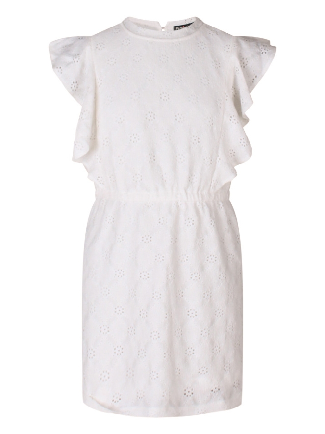 Deze mouwloze zomerjurk is een must-have voor zonnige dagen! De ajourstof en schattige ruches op de schouders geven een speelse en lieve uitstraling.